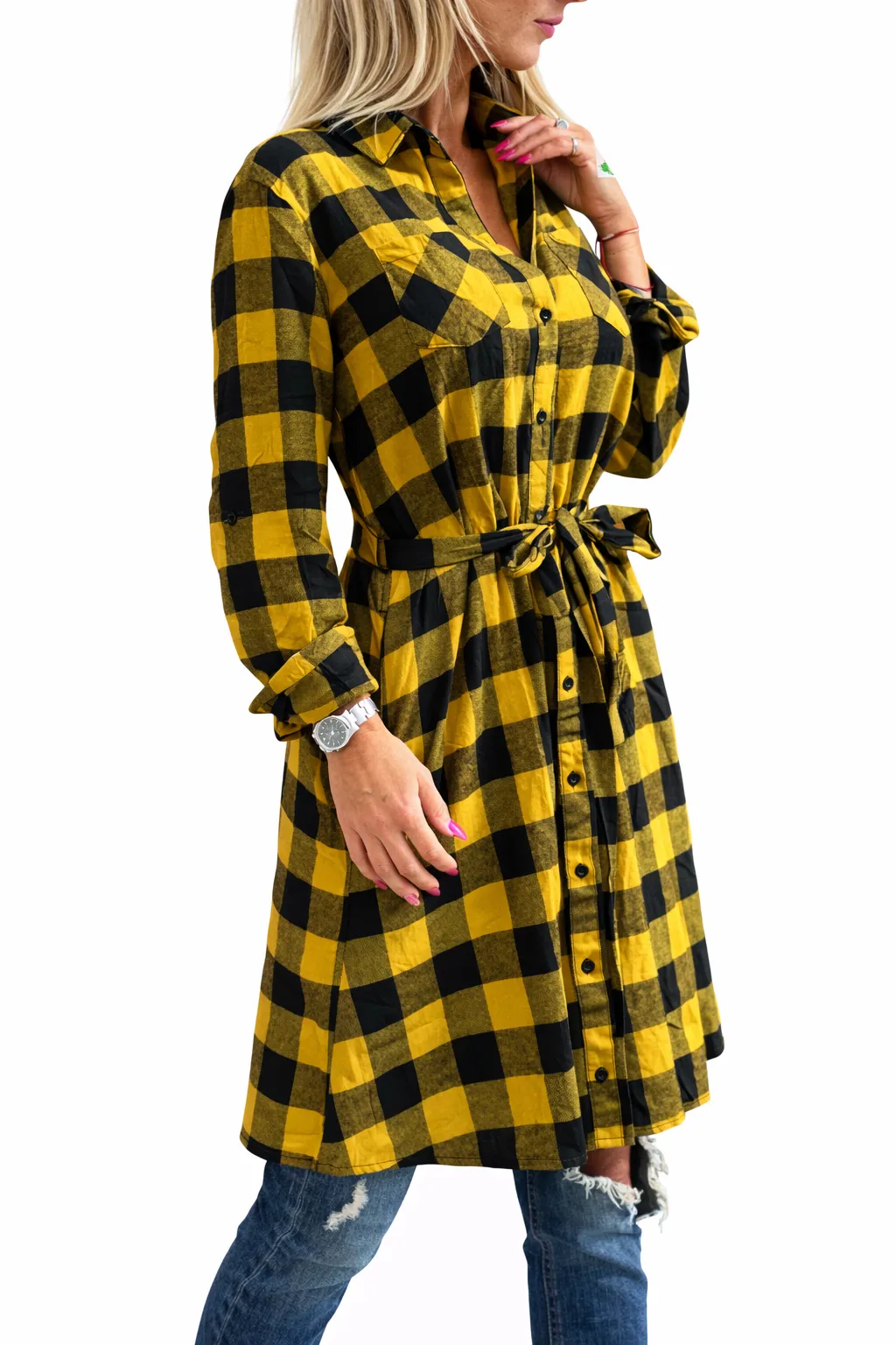 Rolovací rukávy nabízejí všestrannost – můžete je nechat dlouhé nebo je prakticky upravit pomocí knoflíčku. Na prsou najdete praktické kapsy, které dodávají šatům ležérní nádech. Součástí šatů je pásek ve stejné barvě, který zvýrazní pas a podtrhne vaši siluetu. Zapínání na knoflíčky po celé délce dodává šatům klasický vzhled s moderním nádechem.