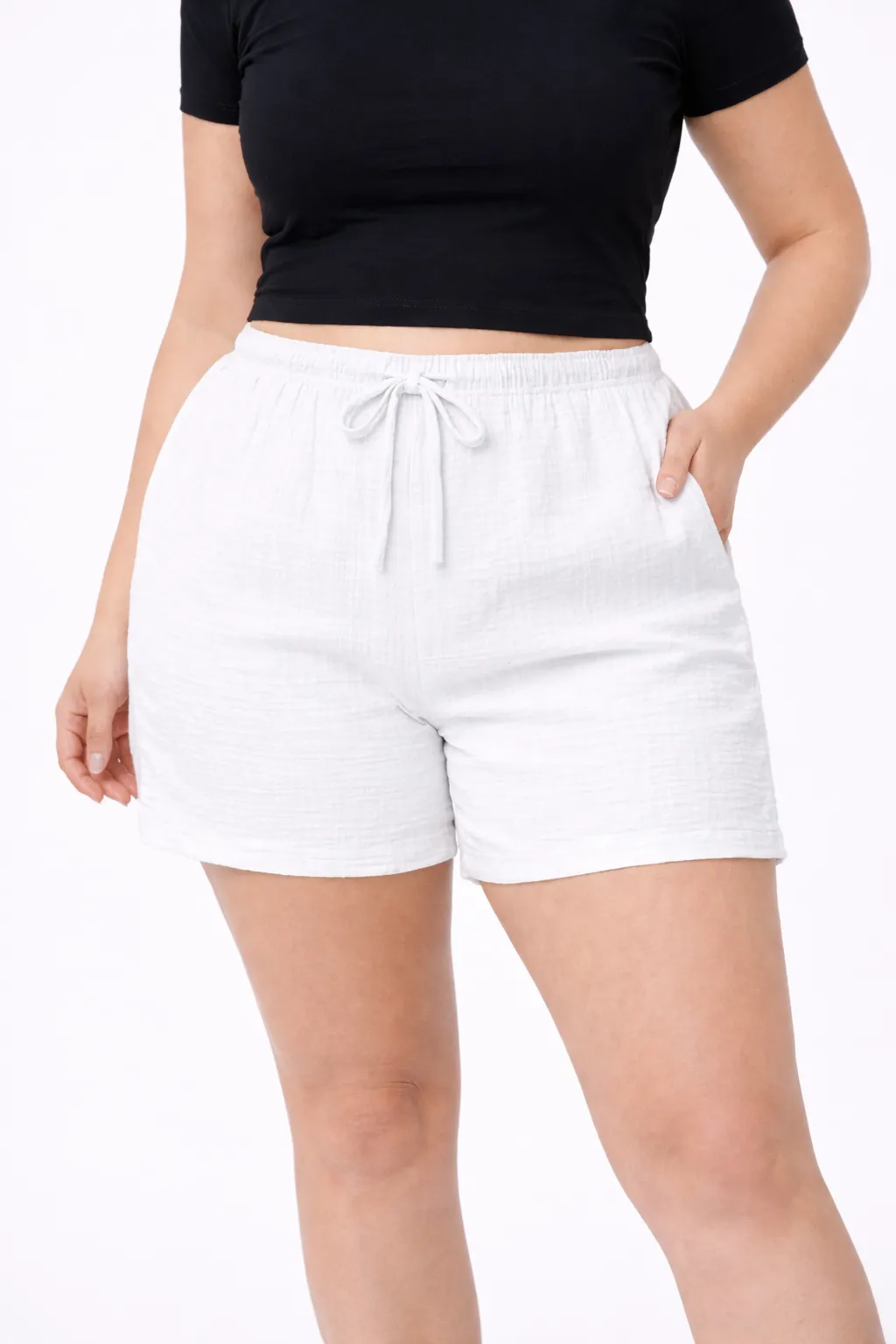 Vyrobené jsou z příjemného mušelínu složeného z 95 % bavlny a 5 % elastanu, což zaručuje jemnost, pružnost a perfektní padnutí. Kraťasy mají boční kapsy, elastický pas a lehce volnější střih, který se přizpůsobí postavě a nikde netáhne.
